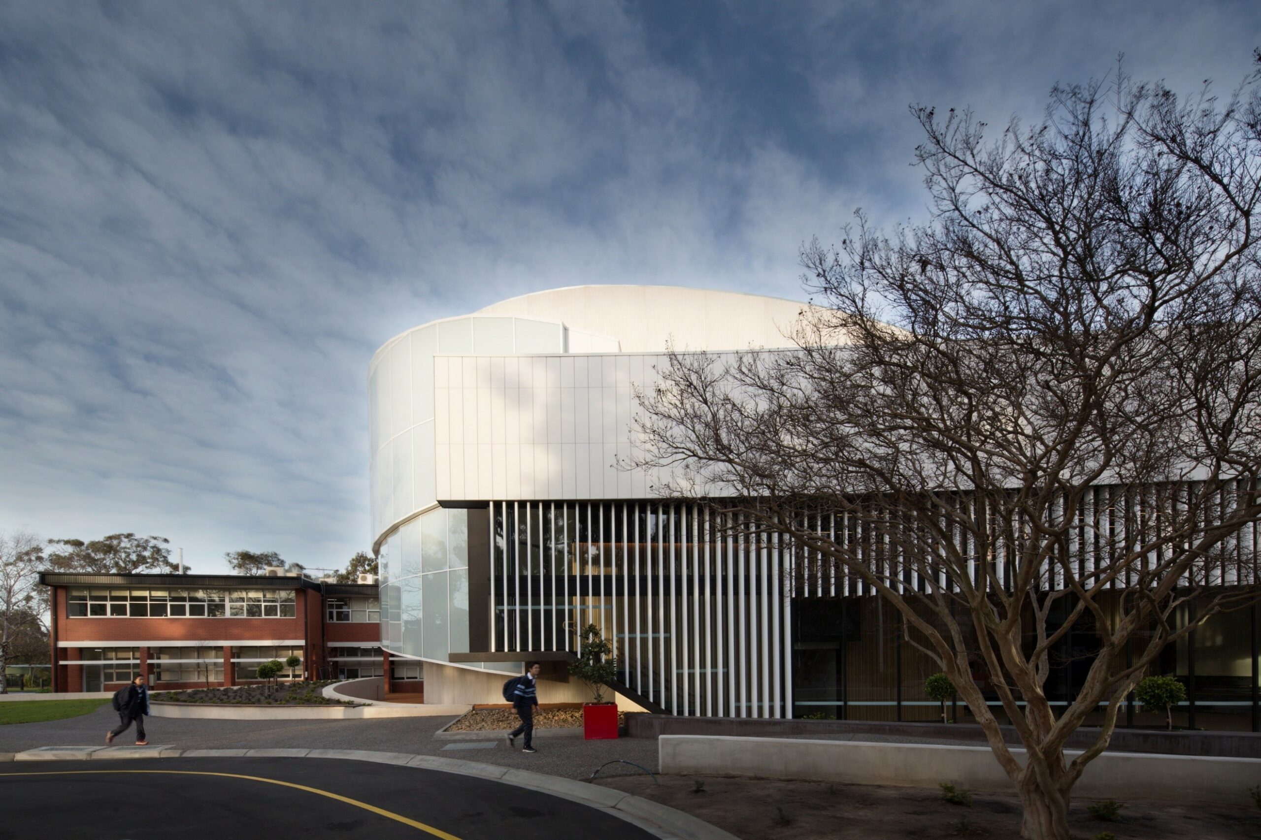 Baldasso Cortese designed a dramatic, drum-shaped building with significant visual impact. It sits in the front of the school and presents a strong and impressive public interface.